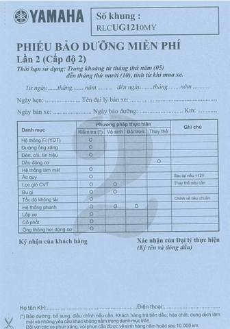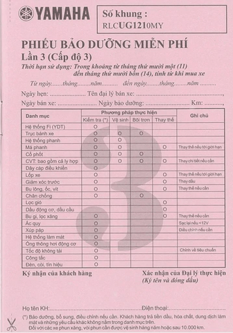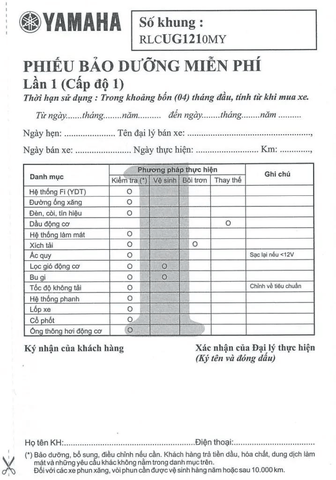 Bao gồm Phiếu lần 1 là phiếu mà mặt trước & sau có nền màu trắng (Tham khảo phần sổ bảo hành) hoặc ô phiếu số 1 trên ứng dụng My Yamaha.