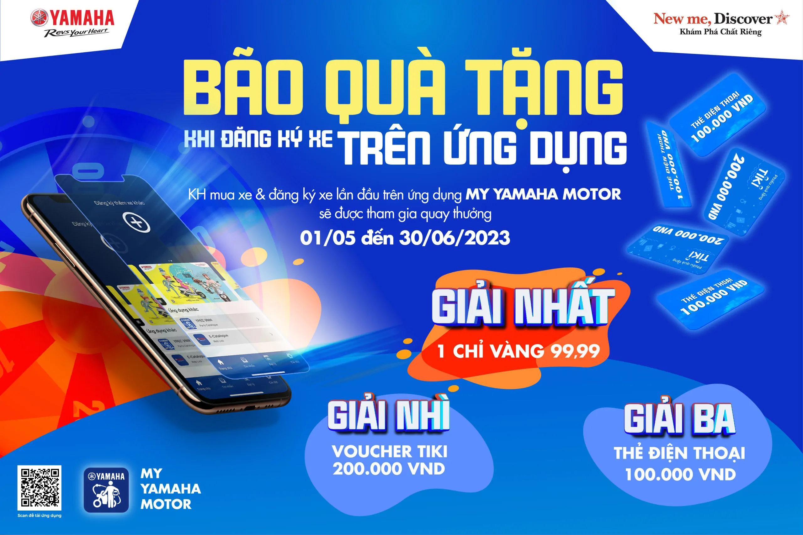 Công ty TNHH Yamaha Motor Việt Nam xin trân trọng thông báo đến quý khách hàng Chương trình khuyến mại “BÃO QUÀ TẶNG KHI ĐĂNG KÝ XE TRÊN ỨNG DỤNG” diễn ra từ ngày 01/05/2023 đến 30/06/2023.